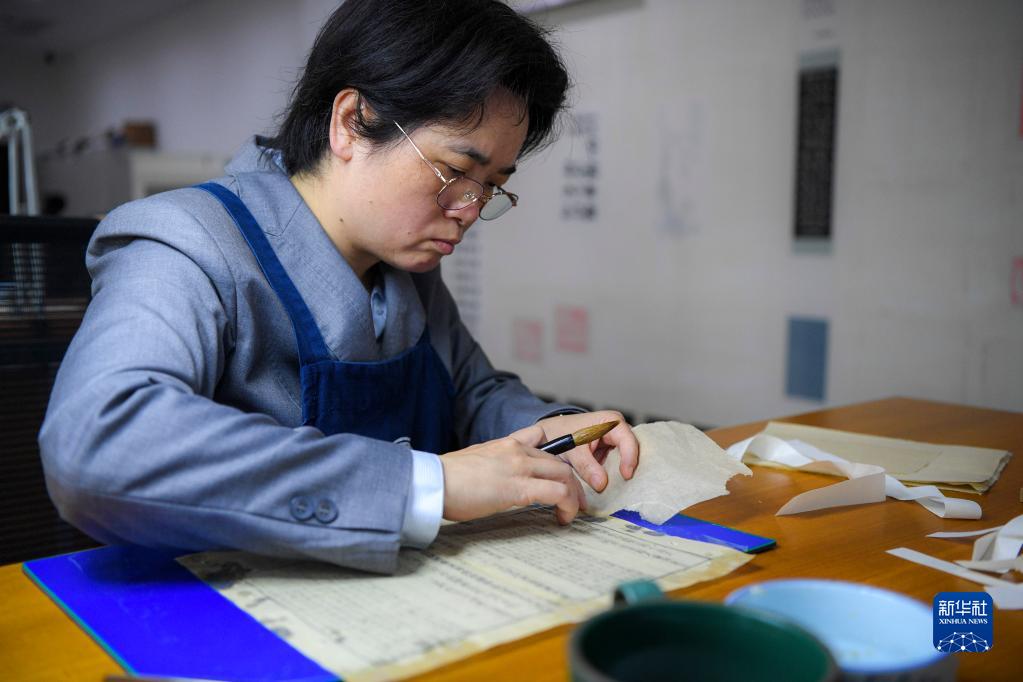 4月14日,在廣西壯族自治區圖書館古籍保護中心的工作室內,黃玉杏在修復古籍。