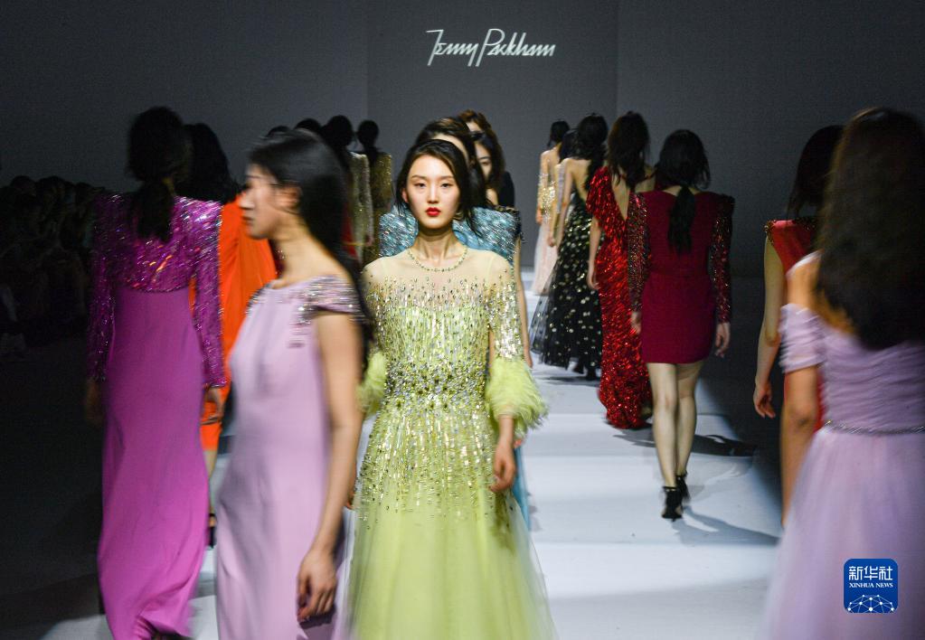 4月11日,模特在消博會時裝周主秀場展示時裝作品。