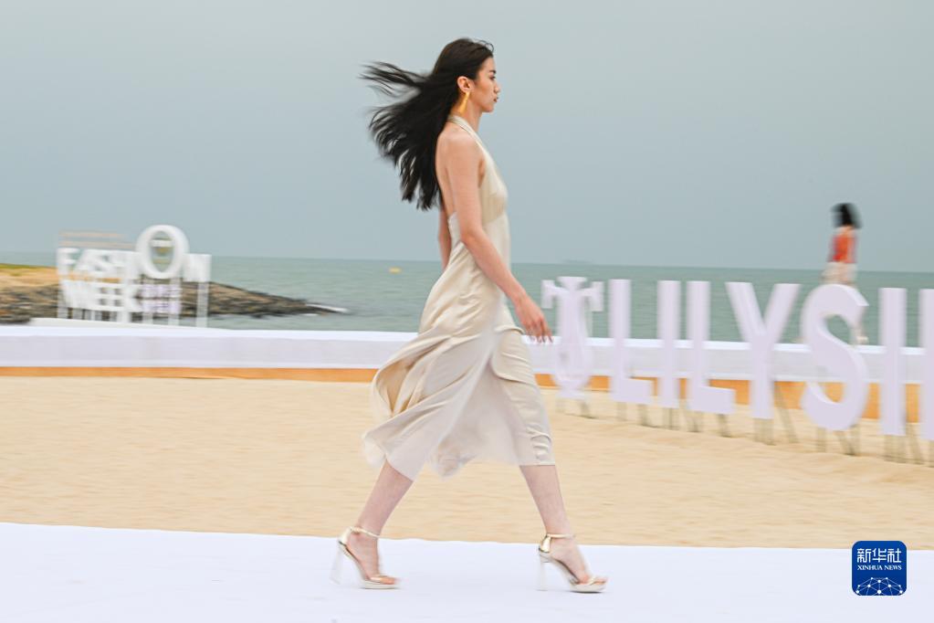 4月12日,模特在消博會時裝周海邊秀場展示時裝作品。