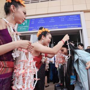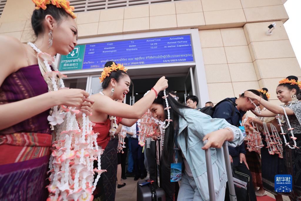 4月13日,在老撾磨丁站,工作人員歡迎乘坐D887次國際旅客列車的旅客。