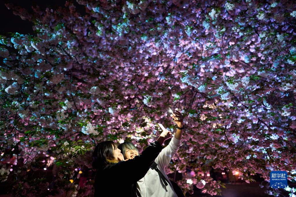 4月10日,游客在日本東京新宿御苑舉行的櫻之燈光秀活動中自拍。