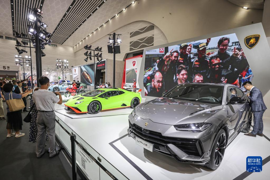 這是4月13日在消博會蘭博基尼展臺拍攝的汽車。