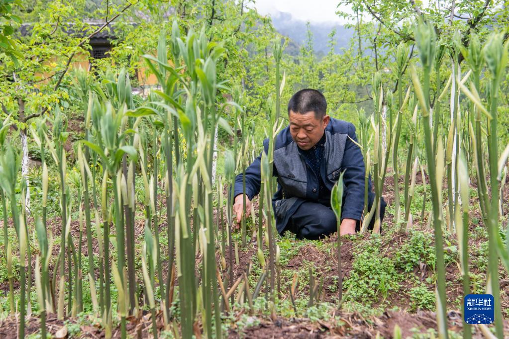 4月14日,在重慶市石柱縣中益鄉一處黃精種植基地,村民在除草。