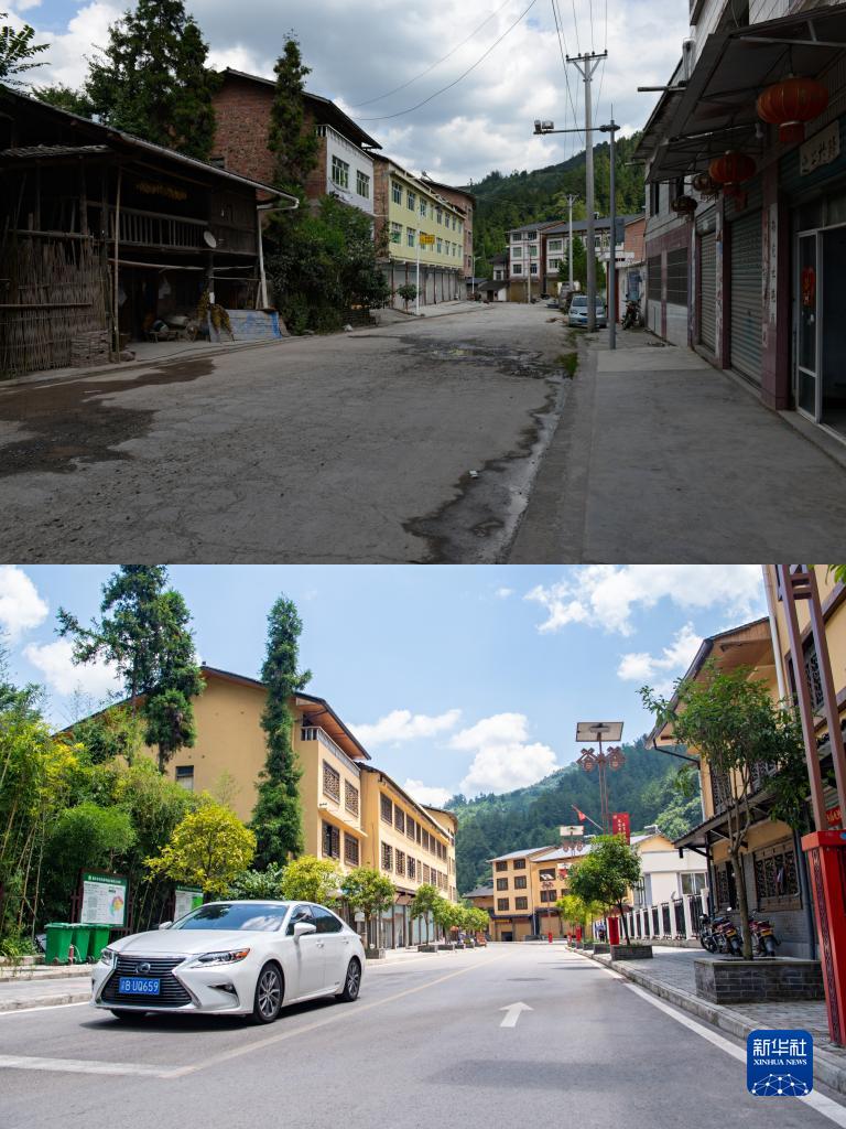 這是一張拼版照片:上圖為重慶市石柱縣中益鄉一處街道舊貌(資料圖片);下圖為2022年8月3日拍攝的重慶市石柱縣中益鄉一處街道景色。