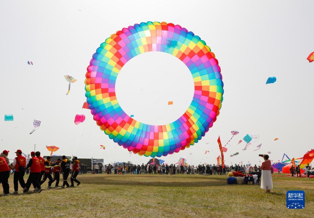 4月15日,參賽選手在濰坊國際風箏會上放飛軟體風箏。
