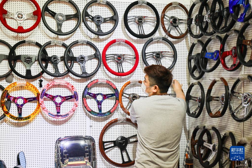 4月15日,參展商在廣交會汽配展區展示方向盤產品。