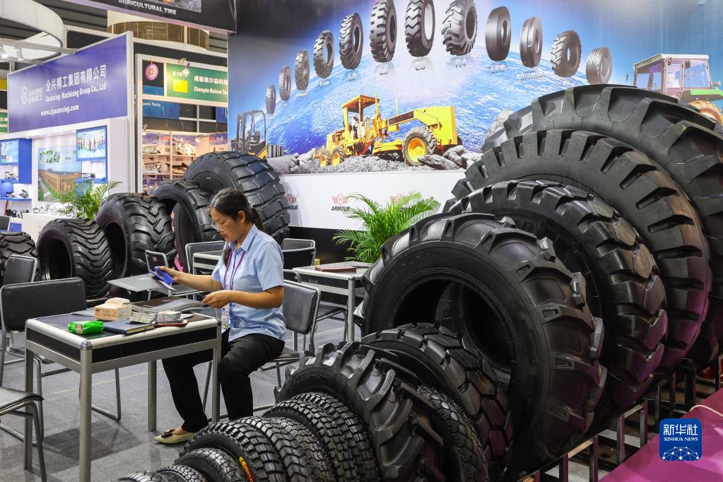 參展商在廣交會汽配展區展示的輪胎產品(4月15日攝)。