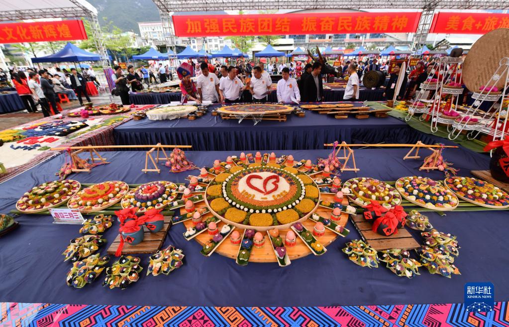 當日,廣西河池市大化瑤族自治縣舉辦“美味三月三”美食大賽,當地各族群眾以糯米、七百弄雞、山羊、河魚等當地特色食材制作的數百道美食參加評比。