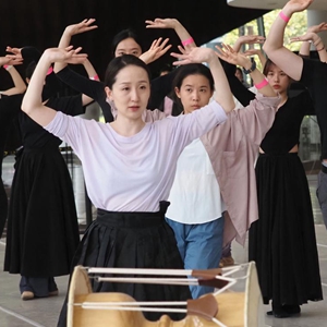 4月15日,舞者向舞蹈愛好者傳授舞蹈技巧。