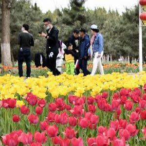 當日,北京永定河綠色港灣郁金香文化節在大興區北臧村鎮開幕,100余萬株各式花卉競相開放,游客徘徊其間宛如游弋在七彩花海。