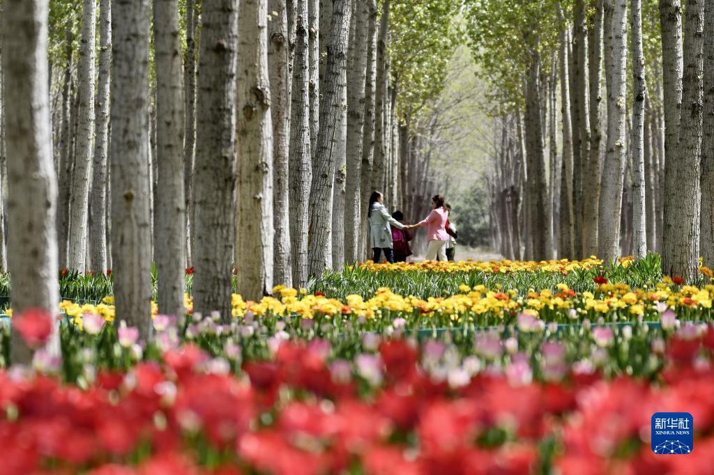當日,北京永定河綠色港灣郁金香文化節在大興區北臧村鎮開幕,100余萬株各式花卉競相開放,游客徘徊其間宛如游弋在七彩花海。