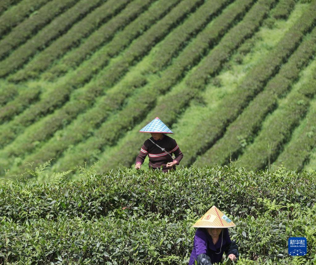 4月15日,貴州省開陽縣南龍鄉東官村一生態茶園,茶農在采摘春茶。