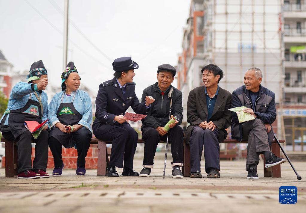 4月15日,在貴州省黔東南苗族侗族自治州丹寨縣金泉街道移民安置社區,民警給居民講解防范電信詐騙知識。