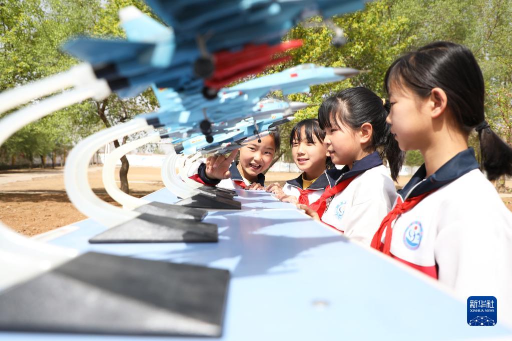 4月15日,在河北省唐山市豐潤區姜家營鎮楊家鋪小學,學生通過模型了解國防武器知識。