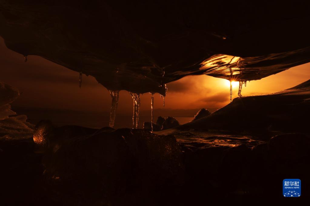 4月6日,賽里木湖畔的冰推在夕陽下散發著光芒。