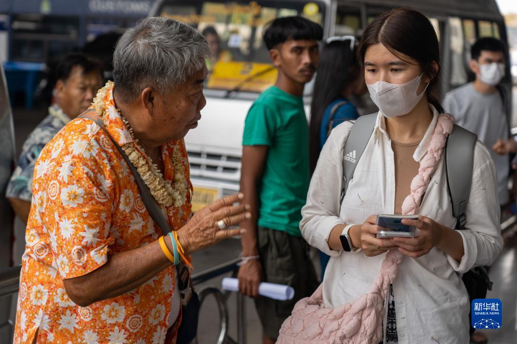 4月13日,在泰國廊開,泰國司機英(左)向一名準備搭乘中老鐵路列車的泰國游客介紹如何前往萬象車站。新華社記者 林昊 攝