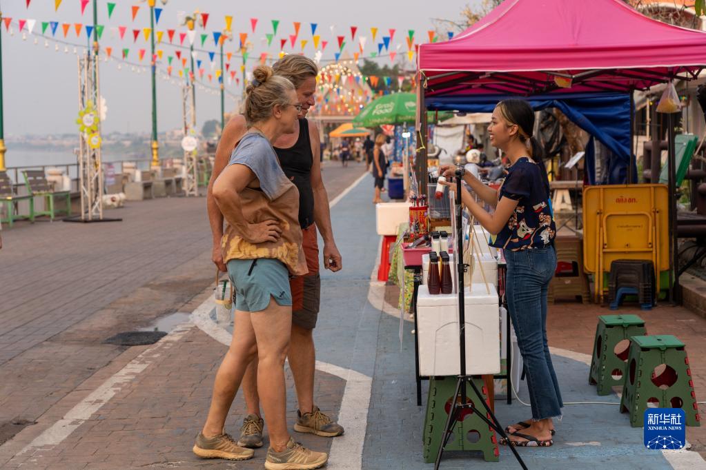 4月12日,在泰國廊開,兩名外國游客與一名當地商販交談。新華社記者 林昊 攝