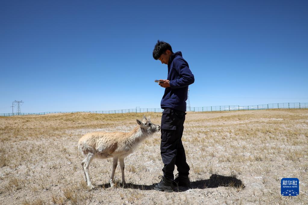 4月15日,索南達杰保護站巡山隊員才文多杰在拍攝被救助藏羚羊幼崽的生長情況影像。