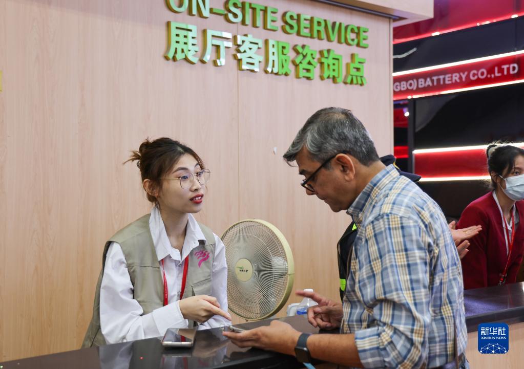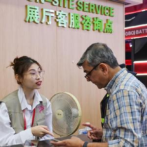 4月15日,廣交會服務人員在展館為來賓提供咨詢。