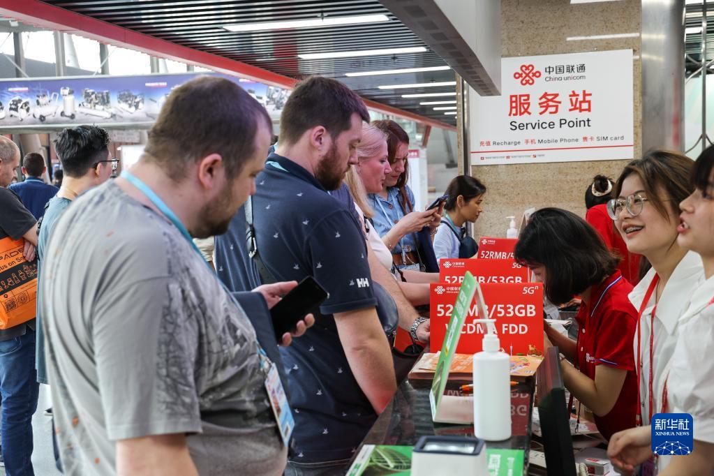 4月15日,客商在廣交會展館內設置的通訊服務點選購電話卡。