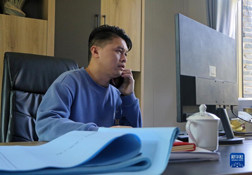 包希孟在辦公室打電話討論旅游項目的推廣事宜(4月7日攝)。