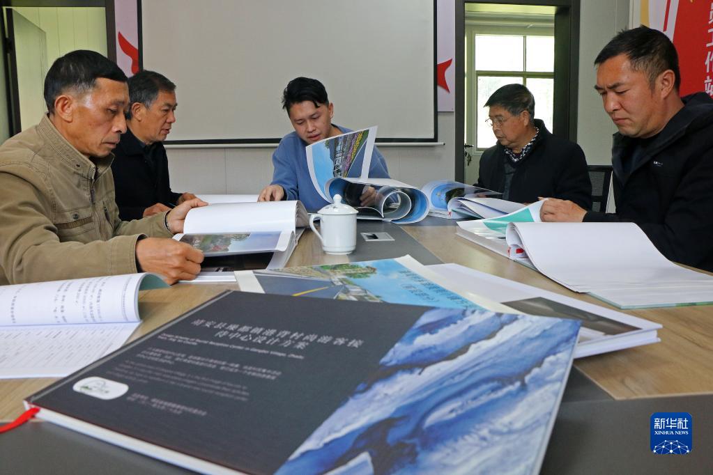 包希孟(中)和公司成員一起討論旅游項目的設計方案(4月7日攝)。
