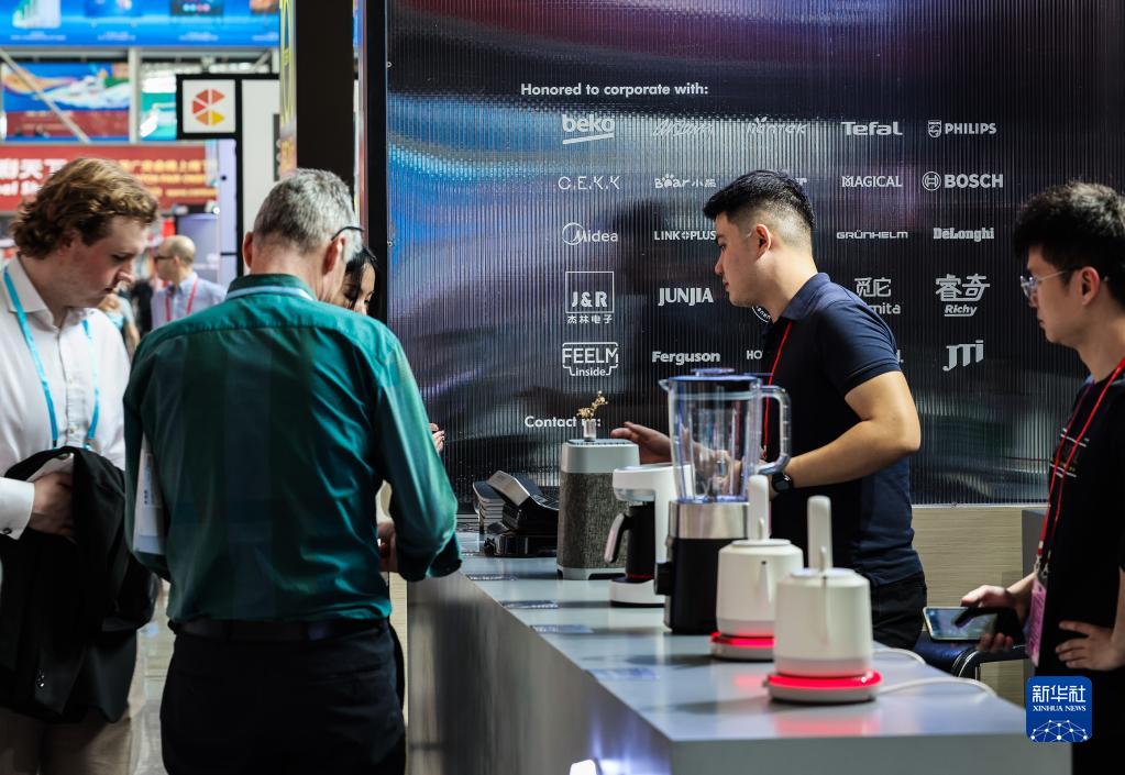 4月15日,采購商在第133屆廣交會上了解一家中國工業設計企業的廚房電器展品。