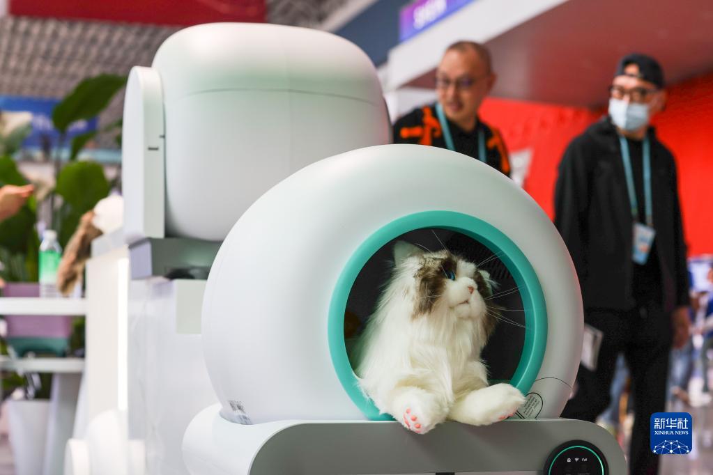 一家中國工業設計企業在第133屆廣交會上展示的全自動貓砂盆等寵物電器(4月15日攝)。
