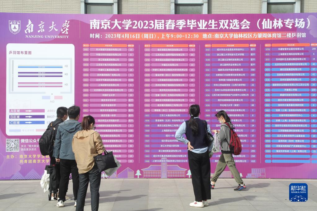 當日,南京大學2023屆畢業生春季雙選會在南京大學仙林校區舉辦。雙選會面向校內外學生開放,吸引了來自北京、上海、南京等地的180家企事業單位參會,提供近1.5萬個崗位。