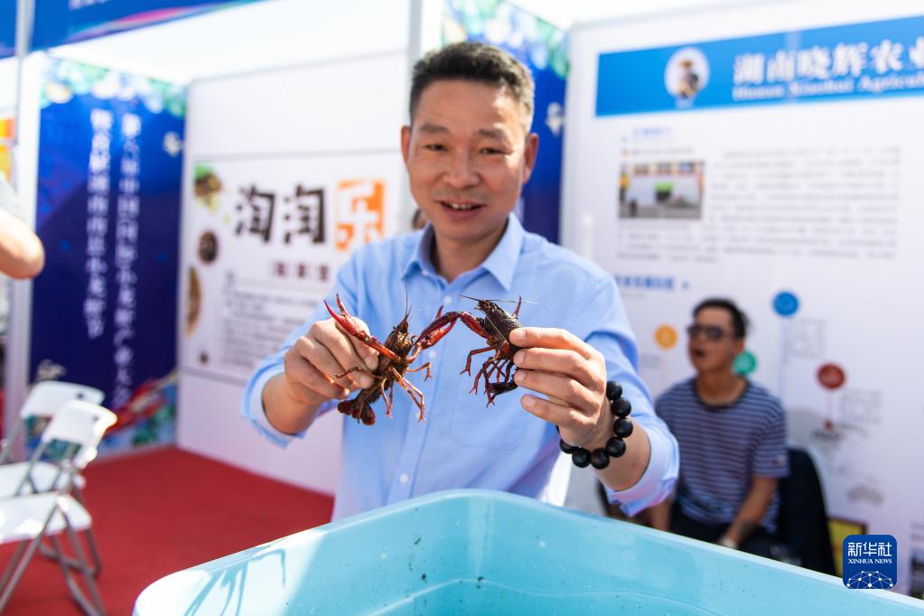 4月16日,在益陽市南縣南洲廣場,參展商在展示小龍蝦。