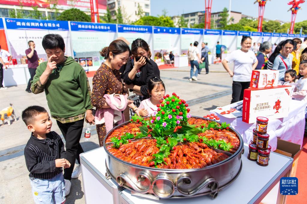 4月16日,在益陽市南縣南洲廣場,觀眾在觀賞小龍蝦拼盤。