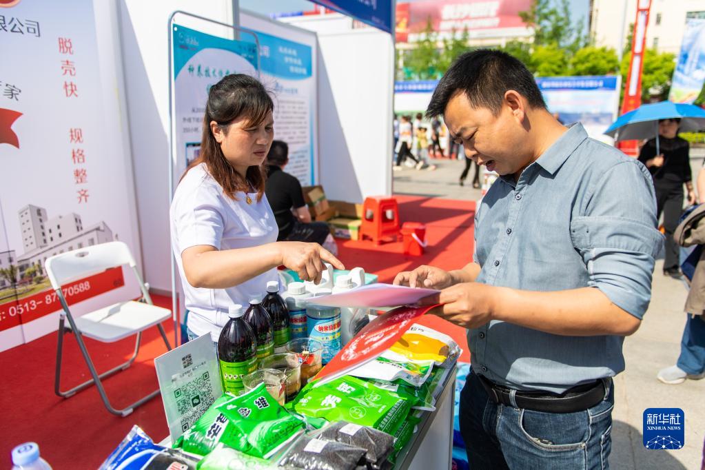4月16日,在益陽市南縣南洲廣場,觀眾(右)在了解龍蝦養殖飼料。
