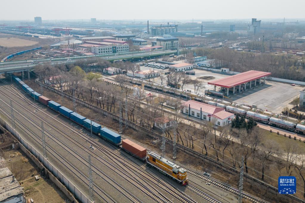 4月16日,國產品牌商品汽車中歐班列駛出哈爾濱國際集裝箱中心站(無人機照片)。