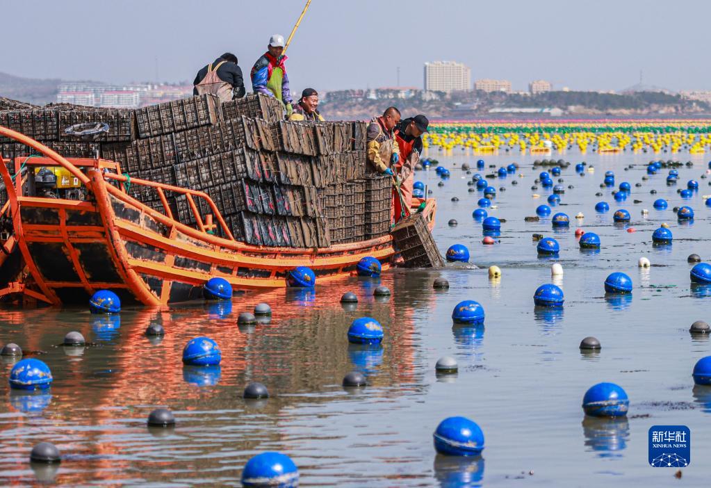 4月16日,在山東省榮成市愛倫灣海域,養殖工人們駕駛漁船將鮑魚投放至養殖海區繼續養殖。