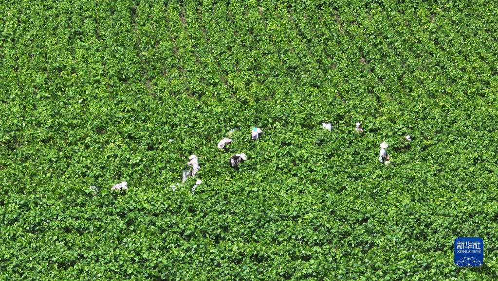 4月16日,在柳城縣沖脈鎮,農民在桑園里采摘桑葉(無人機照片)。