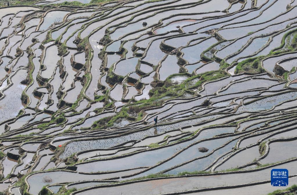 4月16日,在貴州省黔東南苗族侗族自治州從江縣加榜鄉黨扭村,村民從梯田上走過。