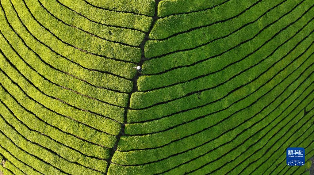 4月16日,茶農在鶴峰縣走馬鎮木耳山茶園采茶(無人機照片)。