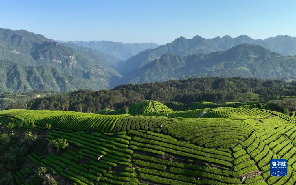 4月16日,茶農在鶴峰縣走馬鎮木耳山茶園采茶(無人機照片)。
