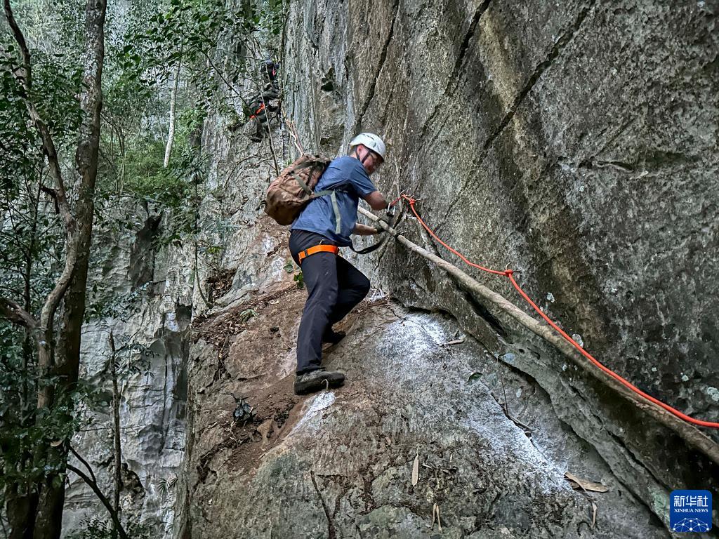 3月15日,聯合科考隊成員、廣西植物研究所的王斌在科考途中攀爬巖壁。