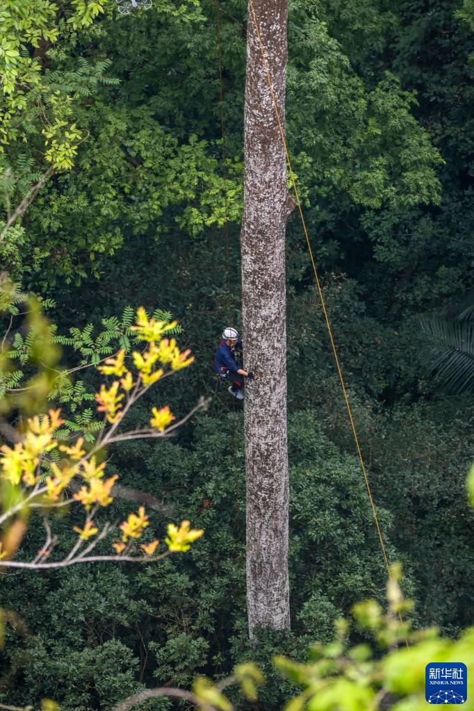 3月15日,南寧藍天救援隊的黃賢銘在攀爬望天樹,準備安裝測量樹高的超聲波信標。
