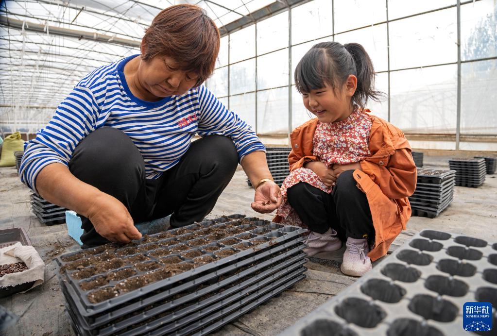 4月17日,在河北省永清縣龍虎莊鄉興晟現代農業園區的育苗大棚內,農戶在育西瓜苗。