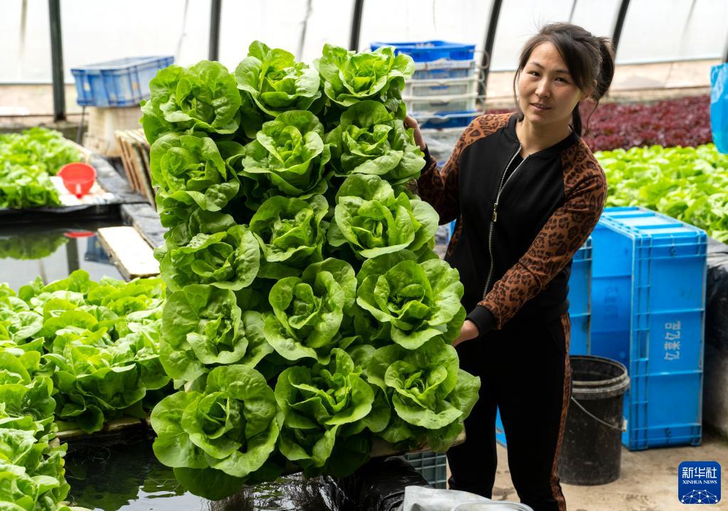 4月17日,在河北省永清縣龍虎莊鄉興晟現代農業園區的水培蔬菜種植大棚內,工作人員在展示水培生菜,該園區的11座大棚每天送往北京地區約8000顆生菜。