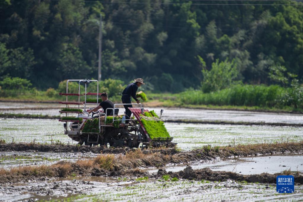 4月17日,在長沙市望城區烏山街道黃花嶺村,村民駕駛插秧機進行水稻插秧作業。