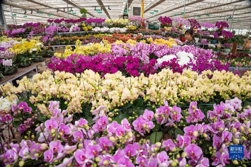 4月17日,在河北省廊坊市永清縣恒美國際花都,一名商戶打理自己家的蝴蝶蘭。