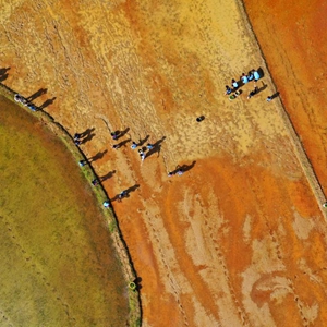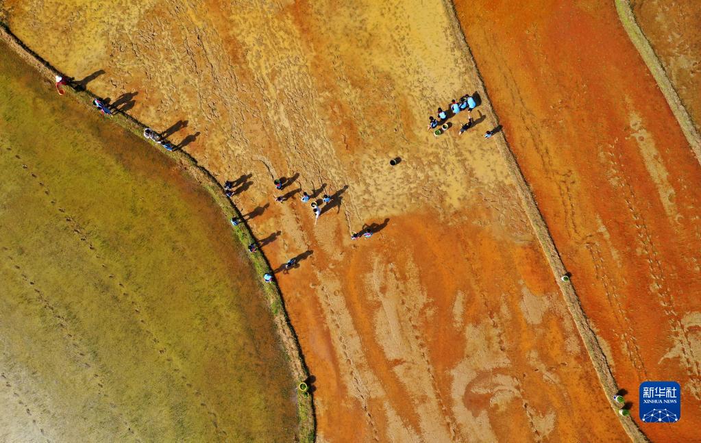 4月17日,江西省吉安市泰和縣塘洲中心小學學生在田間體驗拋秧(無人機照片)。