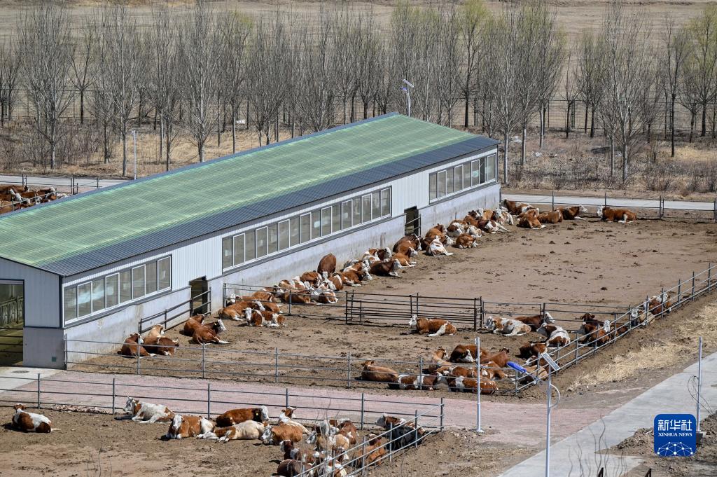 4月12日,在通遼市科爾沁左翼中旗一家肉牛種業公司,牛群在圈舍外曬太陽。