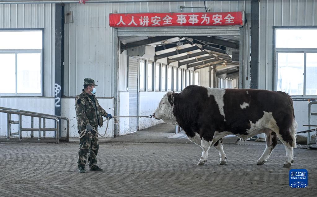 4月12日,在通遼市科爾沁左翼中旗一家肉牛種業公司,工作人員引導種公牛。
