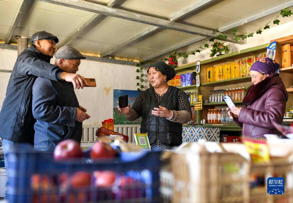周邊牧民來到家中買東西,巴哈提(右二)向顧客展示收款到賬界面,和大伙兒聊天(2月15日攝)。