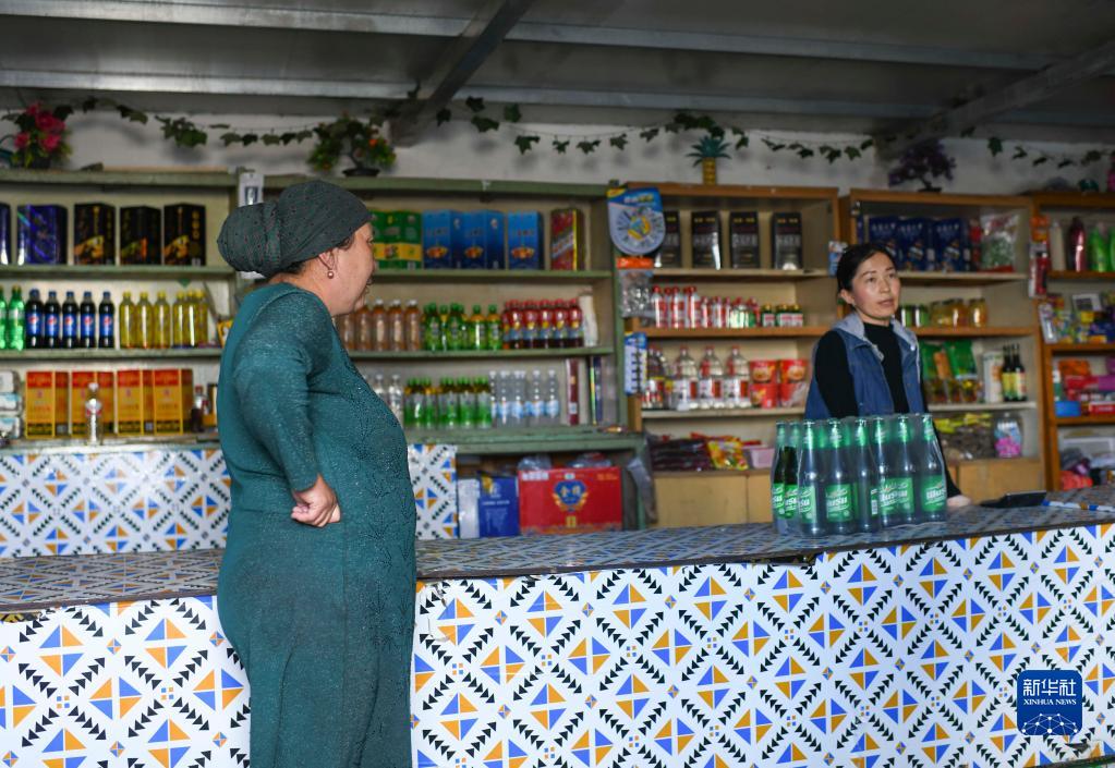 春羔生產期是一年中最繁忙的時節,大女兒加孜拉(右)從60公里外的托里縣庫普鄉趕回牧場幫忙,母女倆在商店內賣東西(4月12日攝)。