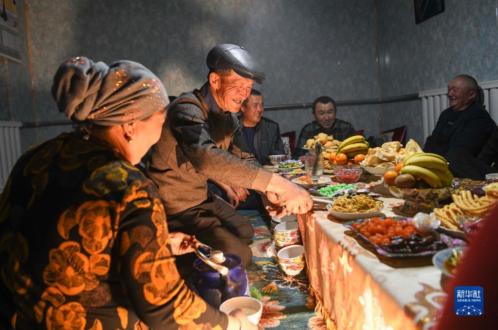 夜間,幾位即將轉場去春牧場的鄰居在家中相聚,巴哈提和丈夫一起招待大家(4月13日攝)。大伙兒要等到冬季再次回到冬牧場時,才能再次齊聚。